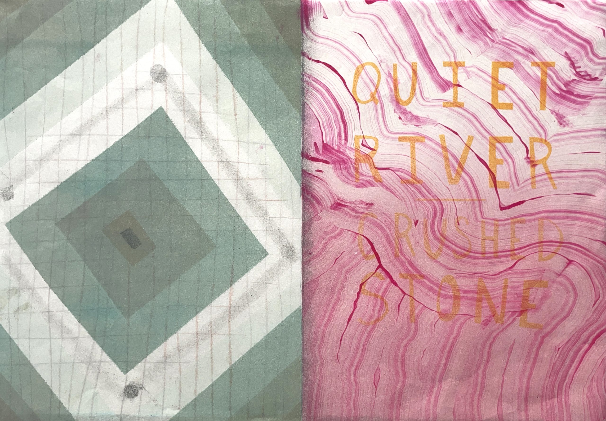 Each began with a loosely improvised background, printed in handmade ink made of plate oil and silver pigment powder. These shimmery surfaces offer a reflective field in which smaller, colorful elements emerge, play, modify and solidify. Each work departs from the silvery surface and builds, offering something fluid and something stable.